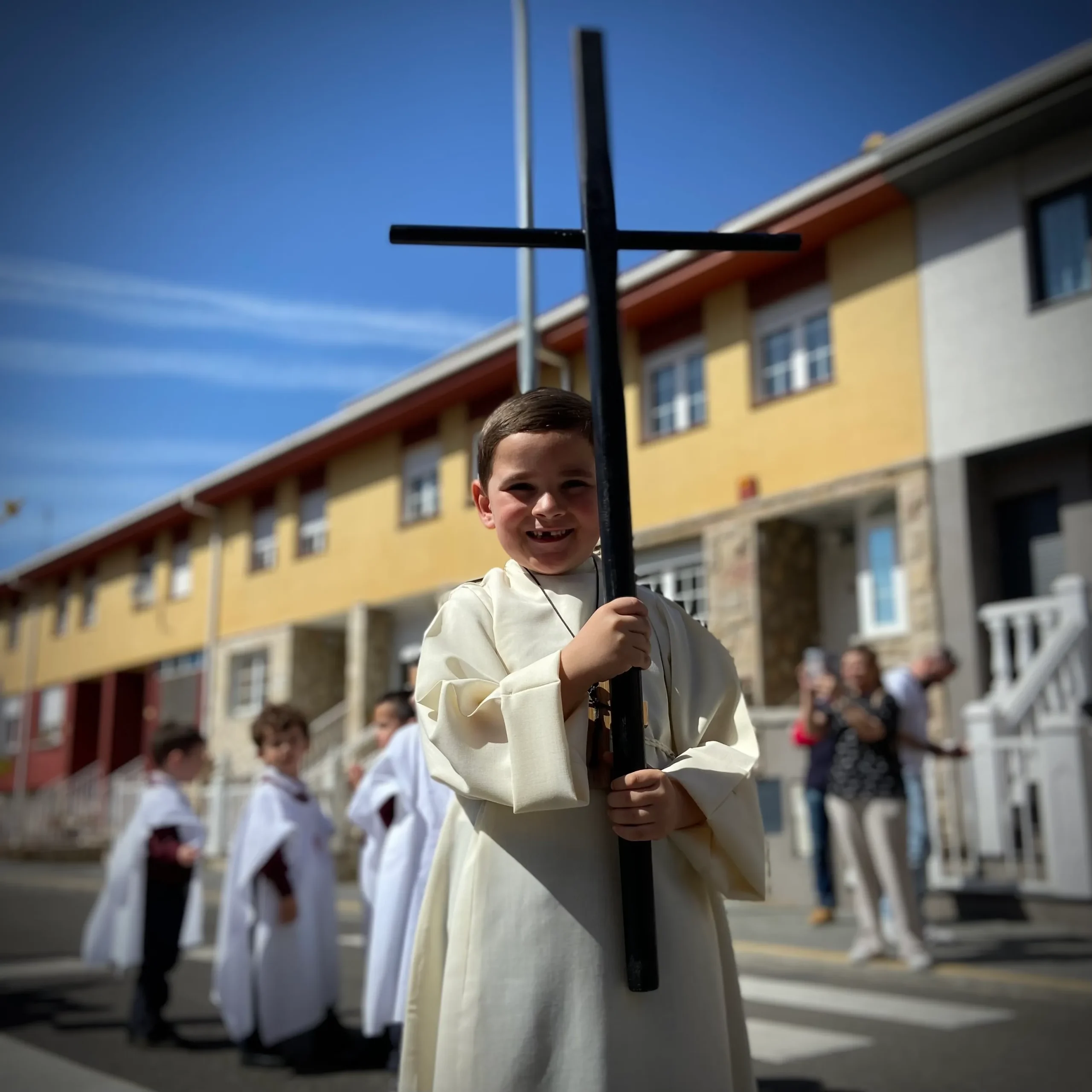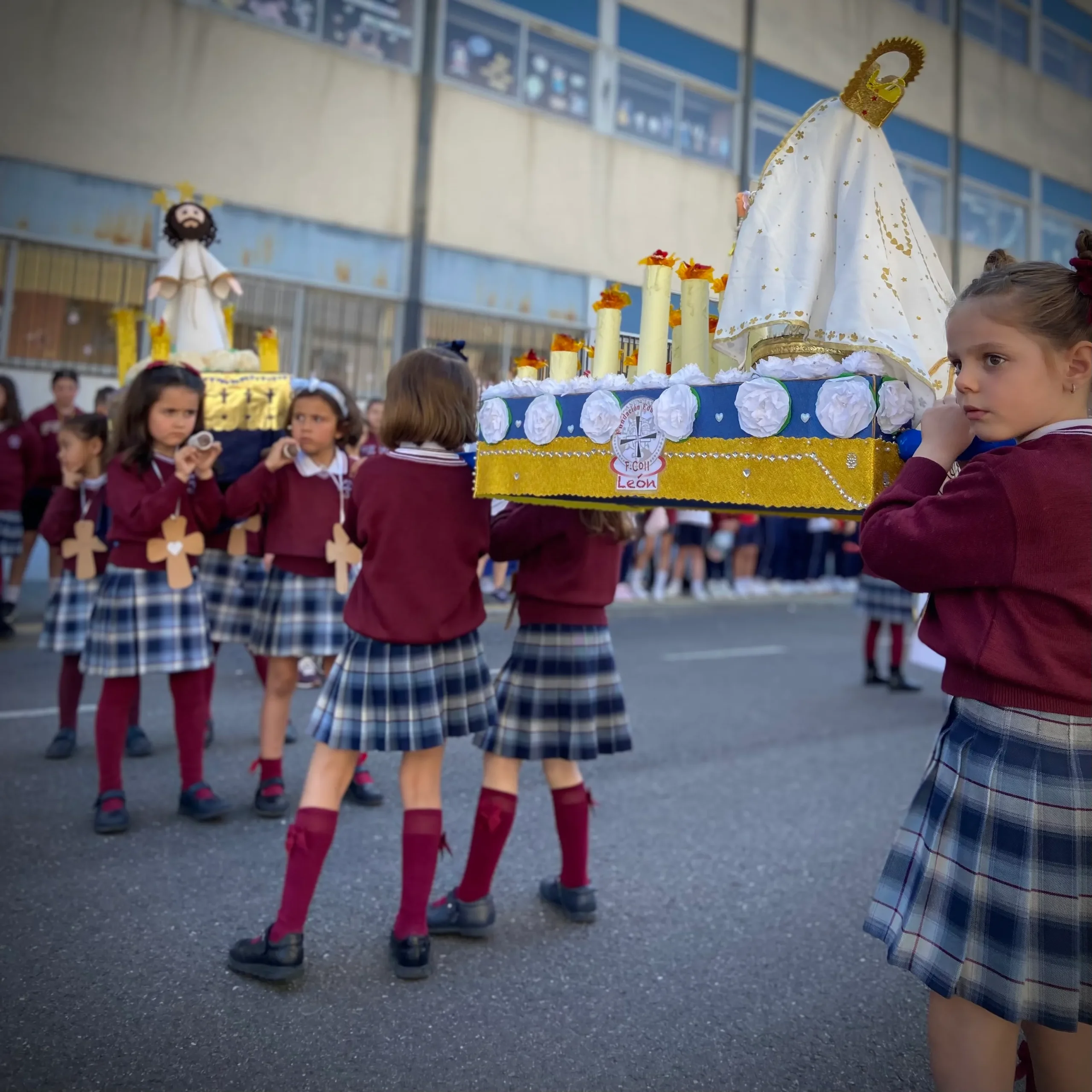 Posteriormente, ataviados con túnicas y detalles inspirados en las Hermandades, los alumnos participaron en la Procesión, recreando con ilusión y respeto una de las tradiciones más arraigadas de nuestra cultura en León, destacando nuestro particular “Encuentro” de la Virgen con Jesús Resucitado. La Banda de Semana Santa puso el broche musical, interpretando marchas que emocionaron a todos los asistentes.